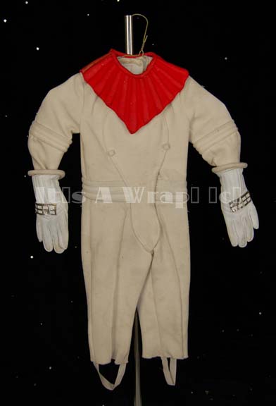 A specialized Starfleet engineer’s white radiological costume featured in Star Trek I: The Motion Picture as part of the forced perspective engineering set but with the red trainee collar that wasn’t introduced until “The Wrath of Kahn”; these costumes were made intentionally small for child sized actors to appear far … |