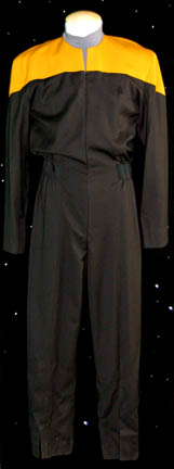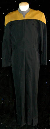 An operations gold Starfleet uniform featured in various episodes of Star Trek: Voyager for wear by Tim Russ in his performance as “Tuvok”. The costume is a black jumpsuit with yellow shoulders, a zip up the front, with a form fitting elastic waist and sewn on loops for ‘away team' … |