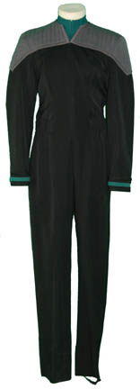 A specially designed Starfleet uniform jumpsuit featured in the Star Trek: Deep Space Nine episode “Rocks and Shoals” for wear by Sarah MacDonnall as “Lisa Neely”. The costume is a black full length jumpsuit with a sewn on operations gold uniform undershirt with an open front revealing a sewn in … |