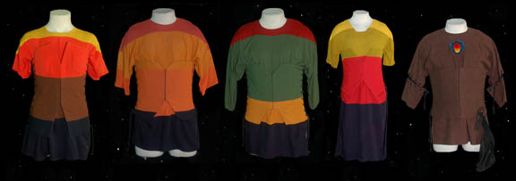 A selection of humanoid alien costumes featured in the Star Trek: Voyager episode “Time and Again” in which the “Voyager” crew comes across a world eliminated by a time-based anomaly. The civilians on the planet wore a collection of costumes made up of multi-colored broad striped shirts and similarly colored … |