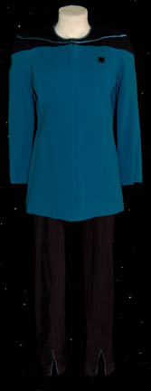 A Starfleet uniform featured in Star Trek X: Nemesis for wear by Marina Sirtis in her portrayal of “Councilor Troi”. The costume is a form fitting black full length jumpsuit with sciences blue division strips on the cuffs and gray quilted shoulders, and an undershirt with sciences blue shoulders and … |