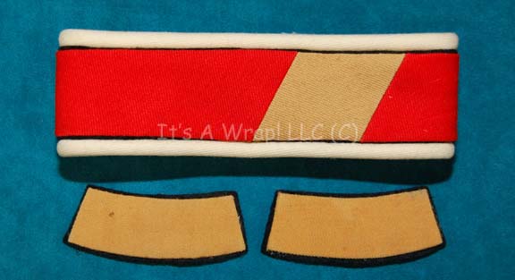 A set of crewman's uniform elements appearing variously in Star Trek feature films, the lot is a white trimmed trainee red division strip for the left forearm sleeve of a white engineer’s radiological suit. It features an engineering gold intention flash in the center. Also present are a pair of … |
