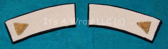 A pair of silver security division-rank strips like those appearing on Starfleet crewman uniforms in Star Trek I: The Motion Picture. The item is off-white fabric with a gold triangle thread embellishment on a black felt backing. This style of accent would have appeared on Starfleet Class-B, C, and D … |