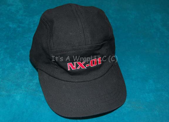 A hat featured in earlier episodes of Star Trek: Enterprise and similar to those worn by “Captain Archer” (Scott Bakula) and various other members of the crew. This item is a black, baseball cap with “NX-01” in red letters with white trim and can accommodate different head sizes. |