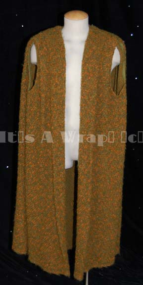 A costume element like those featured in various episodes of Star Trek: Voyager and Enterprise. This item is a sleeveless, full-length robe in multiple shades of green and orange with a wooly, or mottled appearance most likely for use with a long-sleeved shirt underneath or ceremonial purposes. A sewn in … |