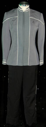 A costume featured in Star Trek X: Nemesis for wear by actors portraying the band at the Riker-Troi wedding. The costume is a pair of black trousers with gray trim and white piping on the outer seams with a gray Starfleet uniform jacket featuring the same white piping and a … |