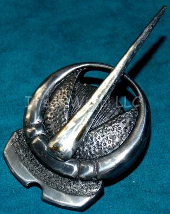 A pewter colored metal ornament for wear on the costumes of Triannon religious extremists featured in the Star Trek: Enterprise episode “Chosen Realm”. The broach appears as a metal circle with adornment and a spike protruding from the bottom of it. The item measures approx. 2 X 3.75 inches. |