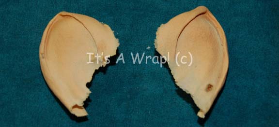 A pair of special effects applications like those appearing on Romulan and Vulcan characters in Star Trek episodic television and feature films. The items are flesh colored latex formed in the pointed, Vulcan-style that fit over the actual ear. Each measures approx. 2½ x 1½ inches. |