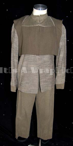 A two piece brown wool alien costume featured in the Star Trek: Enterprise episode “The Catwalk”. This comfortable costume features leather bow details snapping across the zip front and sewn on patches on the shoulders depicting alien character letters. The costumer’s tag reads ‘Stunt Alien #1, Craig Baxley Jr.’ |