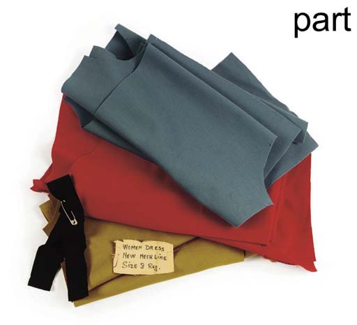 Approximately ten pieces of mustard/gold polyester doubleknit fabric, with wardrobe tag inscribed <I>Women dress, new neckline, size 8 reg</I> -- believed to be an unassembled <I>Original Series</I>-style woman's command Starfleet uniform minidress for the third season of <I>The Original Series or <I>Star Trek: Phase II</I> (a lot) |