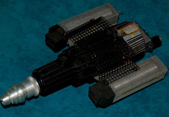 A sturdy molded rubber prop Romulan disruptor rifle made for Star Trek: Deep Space Nine painted metallic pewter with black, metallic copper, and purple accents. The sides of the prop feature purple painted ‘Romulan' character letters and the item measures approx. 19 X 2.75 X 9 inches. Several were used … |