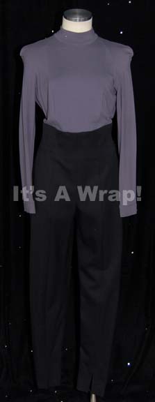 A costume believed to have been featured in the Star Trek: Voyager episode “Muse”. This costume is an adaptation of the normal Starfleet uniform that it consists of a blue-gray, long-sleeved, undershirt sewn directly onto black uniform trousers but still including the hoops at the waist for ‘away team gear’ … |