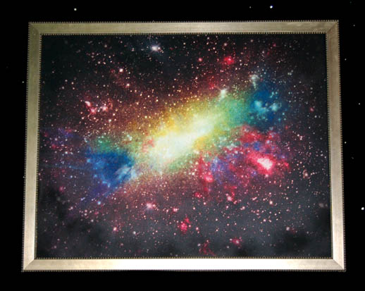A multicolored starfield picture used as set dressing in the briefing room of the Defiant during the Star Trek: Enterprise series. The picture is a print on canvas set in a wooden gold painted frame. Measures approx. 45 x 36 inches. |
