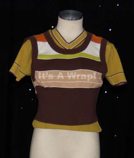 A costume featured in various episodes of Star Trek: Deep Space Nine beginning with the premiere “Emissary”. This costume consists of a sleeveless, olive-green jumpsuit with a Velcro strip on the abdomen, a yellow-green, long-sleeved, mid-riff shirt in the Ferengi style with a metallic design of irregularly shaped spots in … |