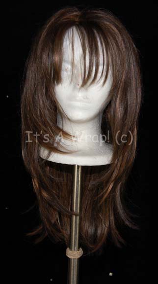 A wig believed to have been worn by “Deanna Troi” (Marina Sirtis) or appropriate double in the later Star Trek feature films. The item is a dark brown and cut in the style by the aforementioned with a simulated scalp underneath to help hold it on. |