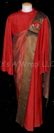 STAR TREK: FEATURE FILMS “VULCAN ROBE” A costume featured in Star Trek feature films like “The Search for Spock” and “The Voyager Home”. This costume is a rust-colored, full-length robe featuring twenty-four inch, pleated, bell-sleeves; a rust-colored sash featuring olive-green stripes, a wide gold and brown striped inset with a … |