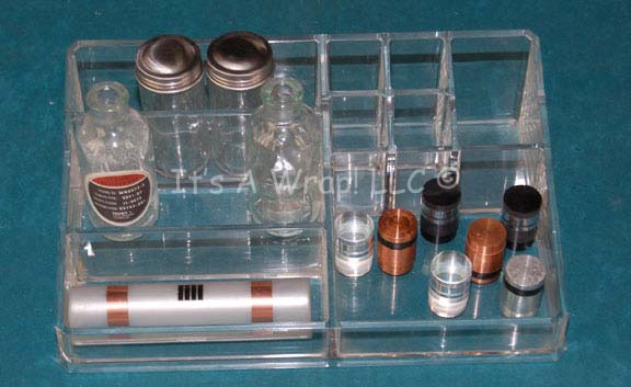 A lot of prop items similar to those featured in various episodes of Star Trek: Enterprise. This lot consists of a clear, plexiglass rack with numerous, variously sized slots for jars, canisters, and other medical accoutrements. Included are two clear, glass jars with screw on lids, two clear glass bottles … |