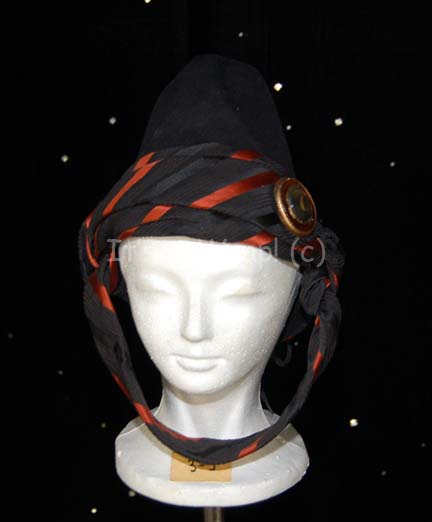 A costume element similar to those featured in various Star Trek feature films. This item is a black, felt, Vulcan-style hat featuring black and rust-colored trim that becomes a chin strap and a round, faux jewel on the left side if the hat with Vulcan iconographic symbols. |