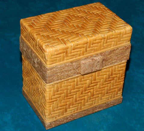 A prop item like those featured in Star Trek: Enterprise episodes like “Civilization” or “Rajiin”. This item is a light tan, woven reed box, shellacked or treated to make it rigid, metal hinges on the back, accents around the lid and bottom made to look like marble or sandstone, and … |