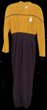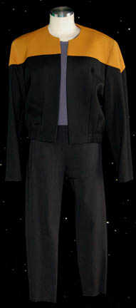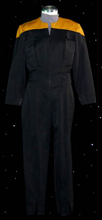A female Operations Gold Starfleet uniform made for wear during the Star Trek: Voyager series. The uniform is black with Operations gold shoulders, a small Velcro patch on the left breast for a Combadge (not included) to attach, a zip up the front and two pleats in the back. Around … |