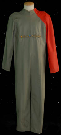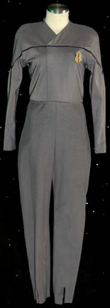 A costume featured in the Star Trek: Voyager episode “Resistance”; wherein “Captain Janeway” (Kate Mulgrew) is forced to rely on an unstable resistance fighter to rescue some imprisoned crew members. This costume consists of a sleeveless, full-length, black jumpsuit made mostly of a stretchy, spandex-like fabric with stirrups for the … |