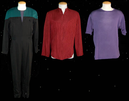 A costume lot similar to those featured throughout Star Trek: Voyager. The first costume is a uniform of a member of the Kazon-Nistrim, once one of the strongest but more recently one of the weakest sects; a sleeveless, woven tunic featuring a pattern of black, various shades of pink, and … |