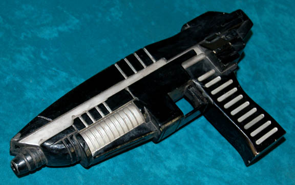 A foam phase pistol used in various episodes of Star Trek: Enterprise. This prop side arm features metallic silver, gray, and black paint with four, smoked acrylic strips set into the top and a felt lined interior vacuum formed, black plastic holster with affixed military style belt clasp and keep … |