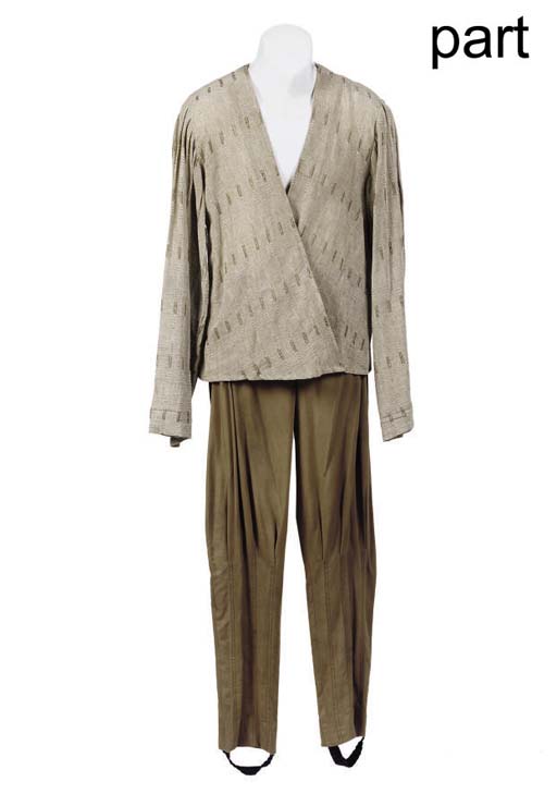 A long-sleeved shirt of beige textured linen, with a pair of brown pants, with stirrups -- worn by Patrick Stewart as Captain Picard at the notorious Risa resort in "Captain's Holiday", label inside indicates subsequent use by other actors; with corresponding wardrobe tag (3) |
