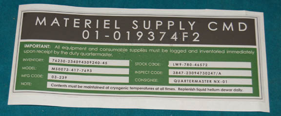 A screen used Starfleet inventory application like those appearing variously in episodes of Star Trek: Enterprise. The item is a ‘Material Supply Command’ application themed in green and black color scheme and depicts realistic warnings and instructions. The item reads ‘Consignee: Quartermaster NX-01’. The application is in excellent condition and … |