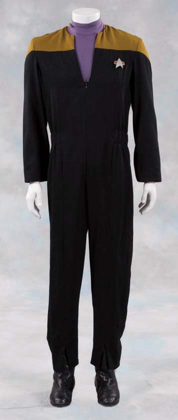 (Paramount, 1994) Geordi La Forge uniform consisting of a black jumpsuit with elastic waistband and zipper front, purple long sleeved uniform undershirt, jumpsuit and tunic both have Star Trek VII handwritten labels “Lavar Burton”, comm badge, three rank pips, and costumers tag written “Geordie, Lavar Burton, change number 3, Scenes … |
