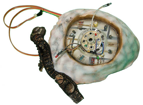 A single Borg scalp made from latex and plastic parts. The “scalp” itself is made from latex, painted to appear pale and blotchy; a sunken section of the scalp is plastic with electrical details, wires attached to exposed lights. Given its excellent condition and the “First Contact” style of painted … |