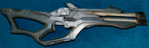 A prop weapon similar to those used by various alien species in several episodes of Star Trek: Voyager and Enterprise like “Retrospect”, “Waking Moments”, and “Marauders”. This prop item is rubber-cast in gray featuring a slick, rounded appearance, silver-colored and black, textured accents and has been changed slightly and/or painted … |