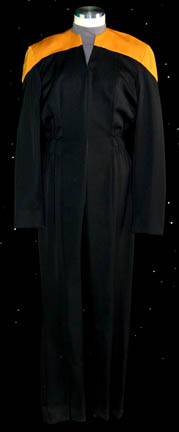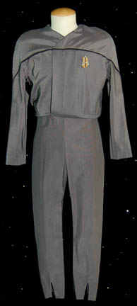 A lot of costumes and costume items featured in various episodes of Star Trek: Voyager. This consists of a long-sleeved, blue-gray undershirt sewn onto black Starfleet uniform trousers, a sleeveless, maternity-variant Starfleet jumpsuit with Operations Gold division colors around the shoulders, standard, uniform trousers with stirrups for the feet, and … |