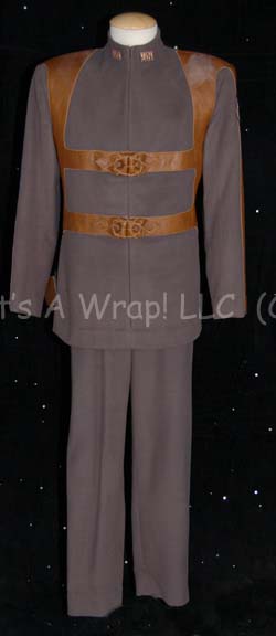 A costume featured in the Star Trek: Enterprise episode “The Catwalk”. The costume is Takret uniform; a set of grey wool trousers with brown leather lining the outside seams of the legs, with a matching uniform top where the brown leather work appears as a harness that is sewn in, … |