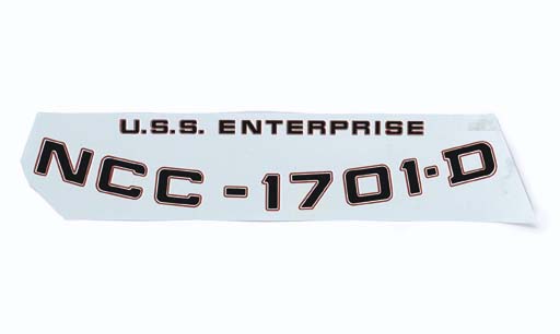 A waterslide decal with navy blue, white, and red silkscreened image reading <I>U.S.S. Enterprise, NCC-1701-D</I> -- <I>13in.</I> -- this decal was prepared as a back-up for the ship's name and registry number markings for the saucer on the large <I>6ft.</I> model of the <I>Starship Enterprise-D</I> |
