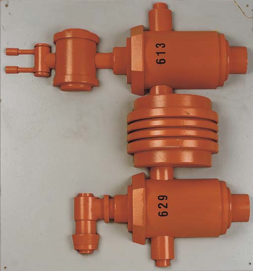 The particle board applied with prop mechanical detailing consisting of wood half-round cylinders, painted grey and orange with black vinyl lettering -- <I>30x28in.</I> -- a detailed re-creation of a wall plant-on used in the original <I>Enterprise</I> corridor set in <I>Star Trek: The Original Series</I>, seen in the <I>Defiant</I> corridor set … |