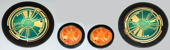 A set of four smoked acrylic disks, two of one size, the other two larger, featured in Star Trek episodic television. The disks are made for console insets and the graphical applications adhered to the reverse are visible when back lit. The larger items depict a green hued asymmetrically rounded … |