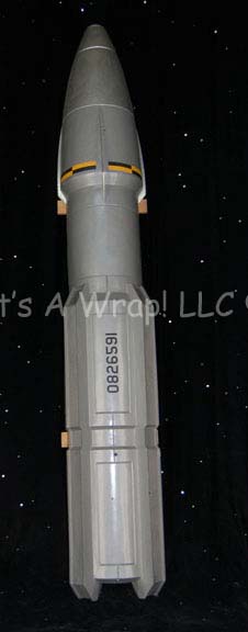 A large fiberglass missile featured in various episodes of Star Trek: Enterprise appearing in the loading racks of the armory on board the “Enterprise NX-01”. The item features silver colored aluminum mini-wings, a wood framed interior, multiple graphical applications, and a unique inventory number printed boldly across the middle. The … |