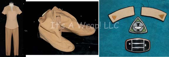 A costume featured in the first Star Trek feature film. This costume is a tan, Class-C, Starfleet uniform consisting of short-sleeved shirt, matching trousers, and shoes with leggings sewn onto them. The lot comes with these unattached items; Medical green shoulder division strips with a gold triangle denoting the non-commissioned … |