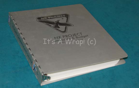 A set dressing binder appearing in the Star Trek: Enterprise episode “First Flight”. The item is a polished metal three ring binder with hinged covers and several sections of white paper contained within which is separated by tabbed dividers. The front cover of the item features an adhered ‘NX’ Project’ … |