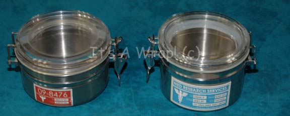 A lot of two jars like those seen in sickbay in various episodes of Star Trek: Enterprise. This lot consists of two short, wide, metal jars with clear plastic lids, sturdy metal latch ensuring sealed closure,; one jar has a polished finished and a Starfleet inventory application that reads ‘Med … |
