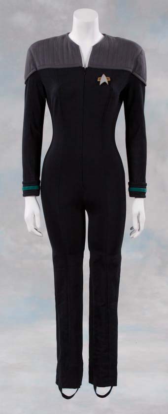 (Paramount, 2002) Black and grey duty uniform with forest green chevron at the cuffs. Back inside collar features two labels, one from exclusive studio tailor Muto Little, and a costume label handwritten “Marina Sirtis – 11-01 – ‘Troi’”. Comes with an original comm badge and a letter of authenticity by … |