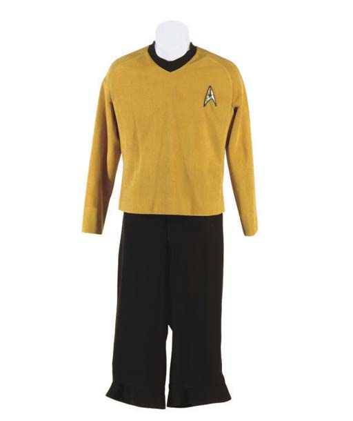 An <I>Original Series</I>-style men's Starfleet uniform, comprising: a gold fleece command shirt with <I>Enterprise</I>-style Starfleet arrowhead insignia, with <I>Deep Space Nine</I> label inside inscribed <I>Musso Sparks</I>; and a pair of black cropped pants, with <I>Deep Space Nine</I> label inside inscribed <I>Matt Lavine</I> -- worn in "Trials and Tribble-ations" in <I>Star … |