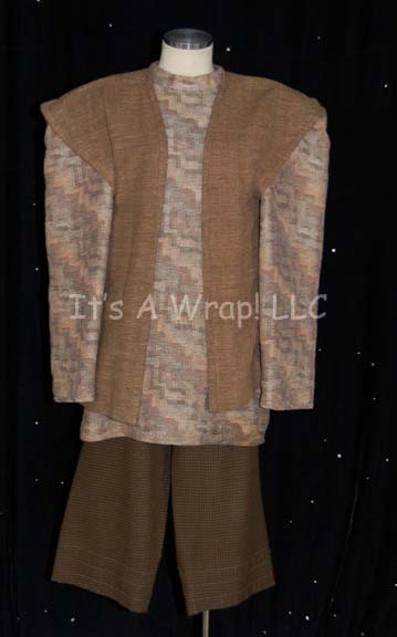 A costume similar to those featured in such episodes of Star Trek: The Next Generation as the “Unification” story arc or in either Voyager or Deep Space Nine where Romulan civilians would be seen. This costume consists of an open, sleeveless, brown vest, olive-colored trousers with a white dot pattern, … |