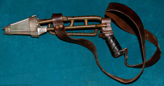 A prop weapon featured in various episodes of Star Trek: Voyager dealing with the Kazon. This item is rubber cast in brown with a black handgrip, brown tube-like construction, an oversized, metal-colored, conical emitter, and a brown, leather strap. Item has been distressed for effect and measures approx. 16 X … |