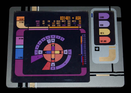 A piece of set dressing similar to those featured in numerous episodes of Star Trek: Voyager. This item is a framed piece of smoked acrylic featuring a graphical application similar to the ones seen on either side of the bridge of the starship “Voyager”; it is a pattern of elongated … |