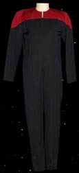 An impressive futuristic Starfleet black and command red jumpsuit with black trim around the shoulders. There is a zip up the back, an adjustable internal waistband and a small Velcro patch on the left side of the chest for a Combadge to attach. The accompanying Combadge is in the alternate … |