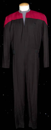 STAR TREK: VOY “CHAKOTAY – STARFLEET UNIFORM JUMPSUIT W/ RANK” A command red Starfleet uniform featured in various episodes of Star Trek: Voyager for wear by Robert Beltran in his performance as “Commander Chakotay”. The costume is a black jumpsuit with red shoulders and an elastic form fitting waist, a … |