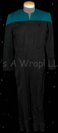 A costume similar to those featured throughout Star Trek: Voyager. This costume a long-sleeved, full-length black jumpsuit featuring Sciences Blue division colors around the shoulders, hoops at the waist for tools, a Velcro patch for a commbadge (not included), stirrups for the feet, and a long-sleeved, blue/gray undershirt. A sewn … |