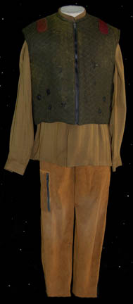 A costume featured in the Star Trek: Deep Space Nine episode “Playing God” for wear by a Trill symbiosis candidate “Arjin” (Geoffry Blake) working under the tutelage of “Jadzia Dax” (Terry Farrel). The costume is concrete colored with trousers and a matching jacket that extends past the waist and features … |
